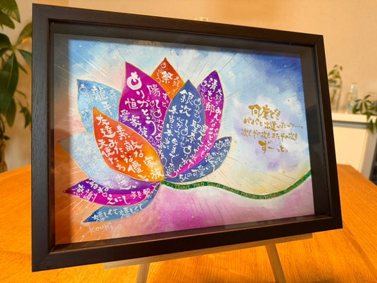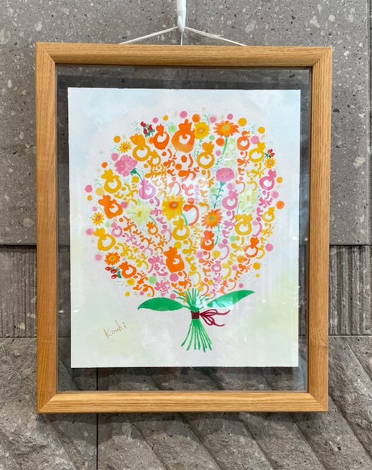 「ありがとうの花束」を書いたきっかけは、母の日。母に送るために書いた一枚の作品です。いつも支えてくれている母に一言のありがとうでは足りず、溢れる感謝を一輪ずつの花として花束にしました。それが花文字絵画『ありがとうの花束』の原点です。