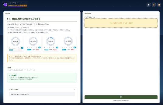 ゲーム感覚で学習のステップをクリアしながら、AI活用の基本的な技術を身に付けられるクエスト型のプログラムです。10ステップで構成され、問題を解いていく中で、生成AIの実践スキルを基礎から応用、開発まで体系的に習得できます。利用対象は、ベリサーブのAI人材教育プログラムの「初級」または「中級」レベルに該当する社員です(図1)。これにより、エンジニア以外の社員を含む全社員のAIリテラシー向上から、開発者の実装力強化までを一体的に推進します。