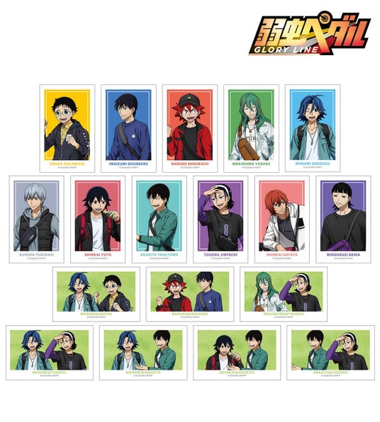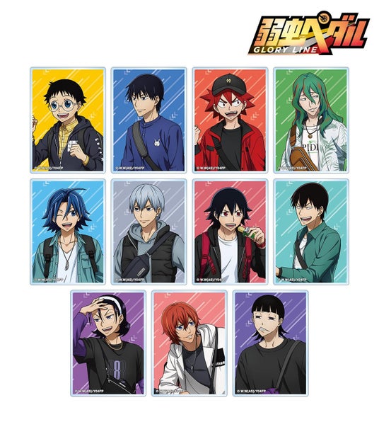 小野田 坂道、今泉 俊輔、鳴子 章吉、巻島 裕介、真波 山岳、黒田 雪成、新開 悠人、荒北 靖友、東堂 尽八、新開 隼人、御堂筋 翔の描き下ろしイラストをアクリルカードに仕上げました。