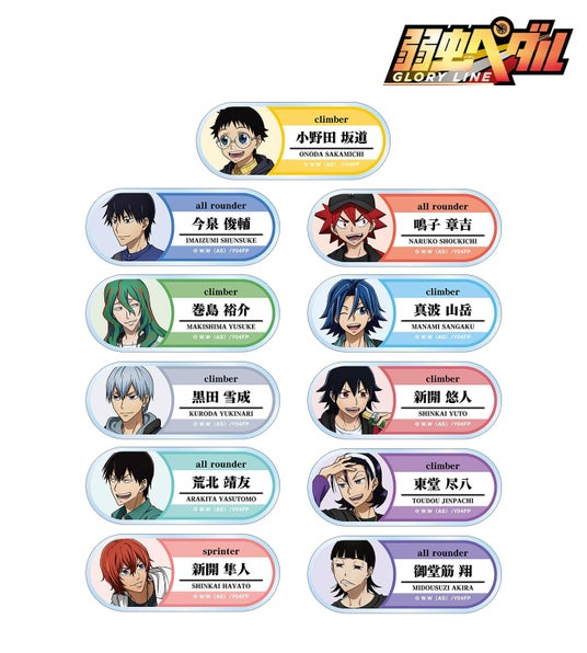 小野田 坂道、今泉 俊輔、鳴子 章吉、巻島 裕介、真波 山岳、黒田 雪成、新開 悠人、荒北 靖友、東堂 尽八、新開 隼人、御堂筋 翔の描き下ろしイラスト、キャラクターの名前、ポジション名をアクリルネームプレートに仕上げました。