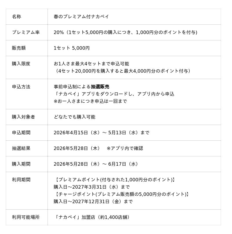また、より多くの方が参加できるよう当選枠を広く確保するとともに、これまで「プレミアム付ナカペイ」に当選したことがない方を優先する仕組みも設けられています。