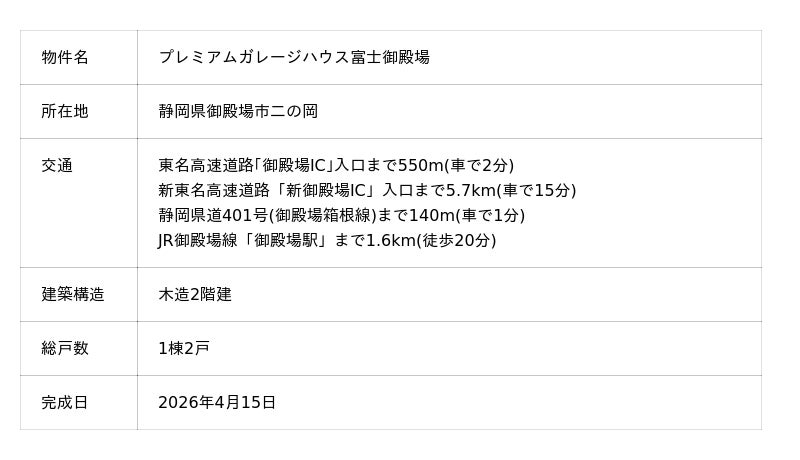 「まちのスキマを、『創造』で満たす。」というパーパスを掲げる、フィル・カンパニーグループ(中核企業:株式会社フィル・カンパニー 代表:外山晋吾 グループ本社:東京都中央区 以下、当グループ)は、2026年4月に、自社開発物件となる「プレミアムガレージハウス富士御殿場」が完成したことをお知らせいたします。