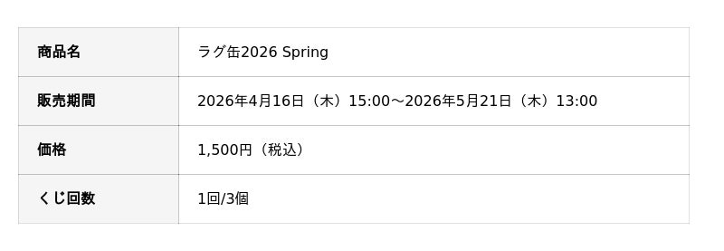 2026年4月16日(木)15:00より、「ラグ缶2026 Spring」の販売を開始いたします!