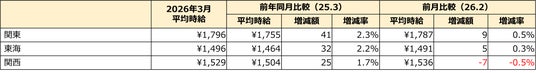 3月度のエリア別平均時給は、全エリアで前年同月比プラス。