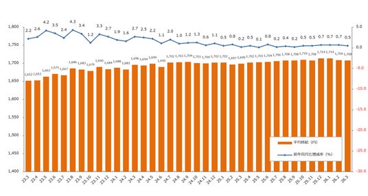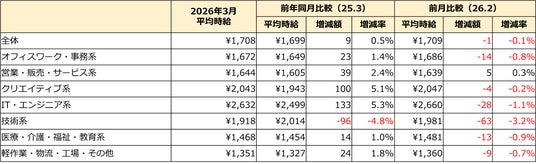 2026年3月度の三大都市圏平均時給は1,708円(前月比-1円・0.1%減、前年同月比+9円・0.5%増)でした。前年同月を上回るのは42ヵ月連続です。オフィスワーク・事務系は、1,672円(前月比-14円、前年同月比+23円)となりました。例年3月は、4月入職に向けた募集がピークを迎える時期にあたります。バリエーション豊かな求人の中には、特定の顧客管理システムの使用経験を求めるような、時給2,000円を上回る専門性の高い求人もあり、時給水準を下支えしました。その一方で、未経験者歓迎の求人や郊外エリアの募集も増加し、職種全体の平均時給は前月比で微減となりました。