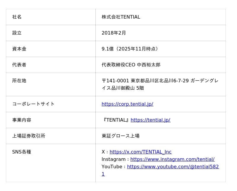 株式会社TENTIALは、「健康に前向きな社会を創り、人類のポテンシャルを引き出す。」をミッションに掲げ、コンディショニングブランド『TENTIAL』を運営しています 。代表取締役CEO中西裕太郎は、プロサッカー選手を目指した高校時代に病気で夢を絶たれた原体験から、自身のポテンシャルを最大限に発揮するためには健康と日々のコンディショニングが不可欠であると痛感。この経験から株式会社TENTIALを創業し、世の中に「コンディショニングを実装する」ことを目指しています。コンディショニングブランド『TENTIAL』は、アスリートの知見と最新技術・研究に基づき、機能性を追求した製品・サービスを提供。24時間365日、日常生活のあらゆるシーンで心身を整え、疲労回復やパフォーマンス向上をサポートするコンディショニング活動を推進しています 。すべては個人のコンディションとポテンシャルを引き出すという信念のもと、株式会社TENTIALは、健康に前向きな社会の実現のため、コンディショニングの社会実装に取り組んでまいります。
