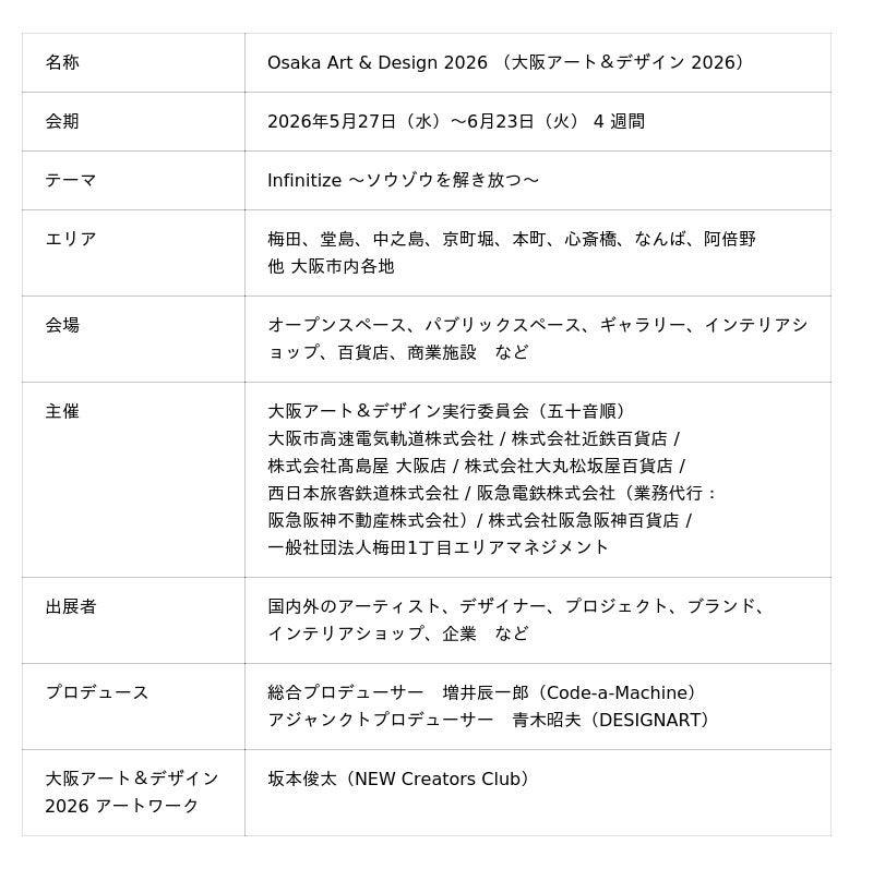 大阪の街を巡りながら多彩なアートやデザインに触れる周遊型エリアイベント「Osaka Art & Design 2026」。第4回を迎える今年は「Infinitize ~ソウゾウを解き放つ~」をテーマに、5月27日(水)~6月23日(火)の4週間にわたって開催します。