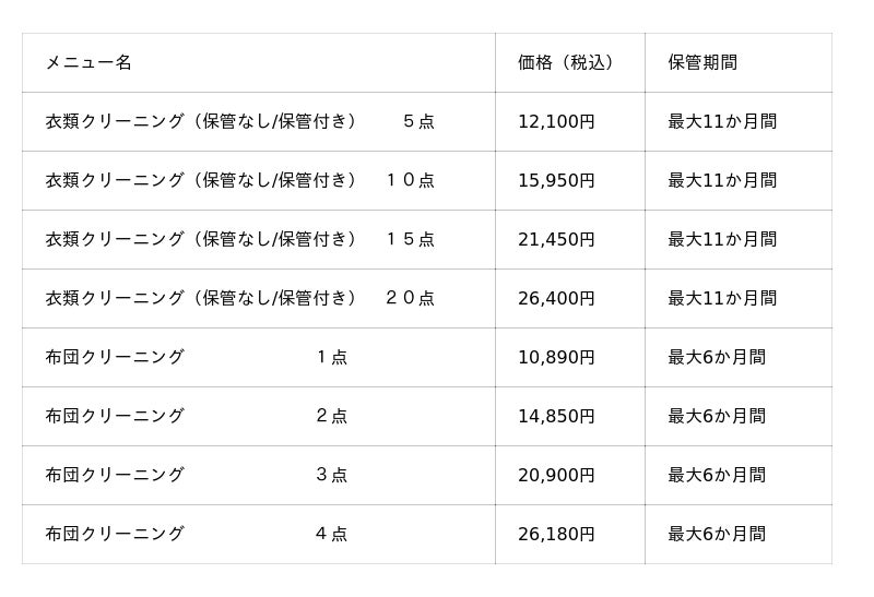 ・「衣類クリーニング(保管なし)」「衣類クリーニング(保管付き)」「布団クリーニング」の3つのメニューを用意。