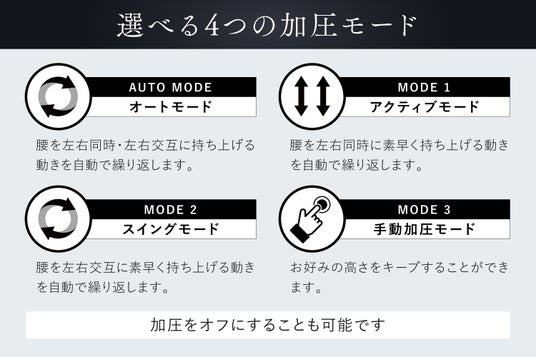 オートモード、アクティブモード、スイングモード、手動加圧モードを搭載。気になる部位に合わせたお好みのケアができます。加圧をオフにしたまま使用することも可能です。