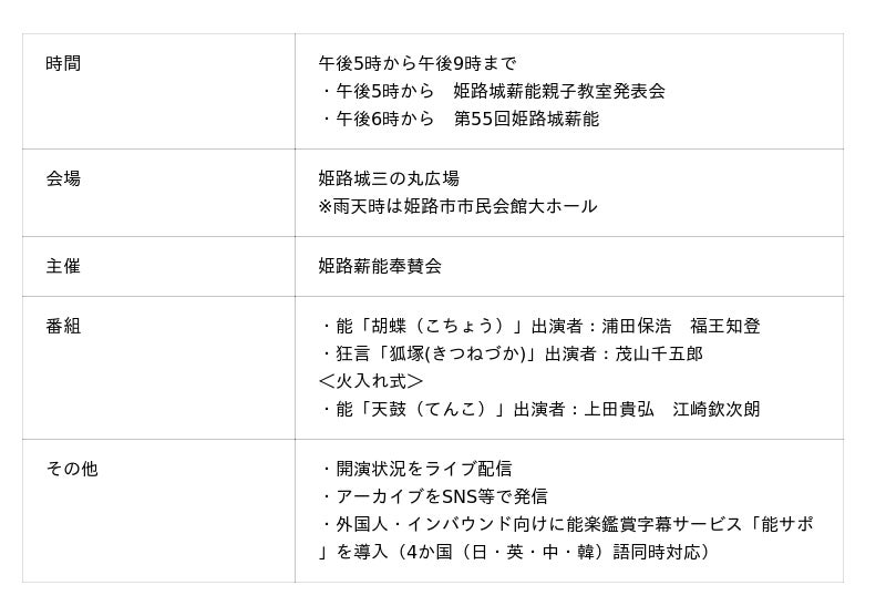 一日目である5月22日(金曜日)は、第55回姫路城薪能を開催します。姫路城を借景に優美で迫力ある舞台を展開します。