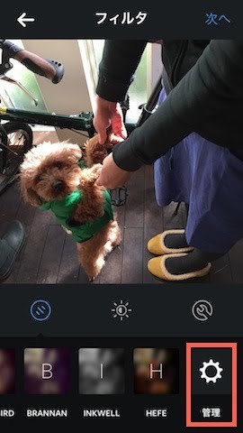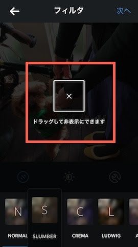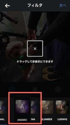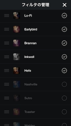 で、このフィルタの並び替えが自由にできるようになったのです。フィルタを選ぶ画面で、動かしたいフィルタを長押しします。すると、前にもってきたり、後ろに持ってきたりと移動ができるので、よく使うフィルタを前にもってきましょう。