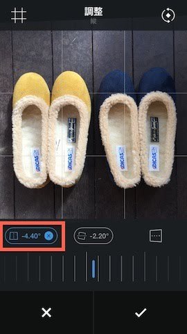 角度調節機能は以前からありましたが、その機能がより進化したのです。縦方向と横方向を選択してから、角度の調整ができるようになりました。横方向の傾きを調節したい時は、右の四角をタップして、中央のスライドバーで微調節します。