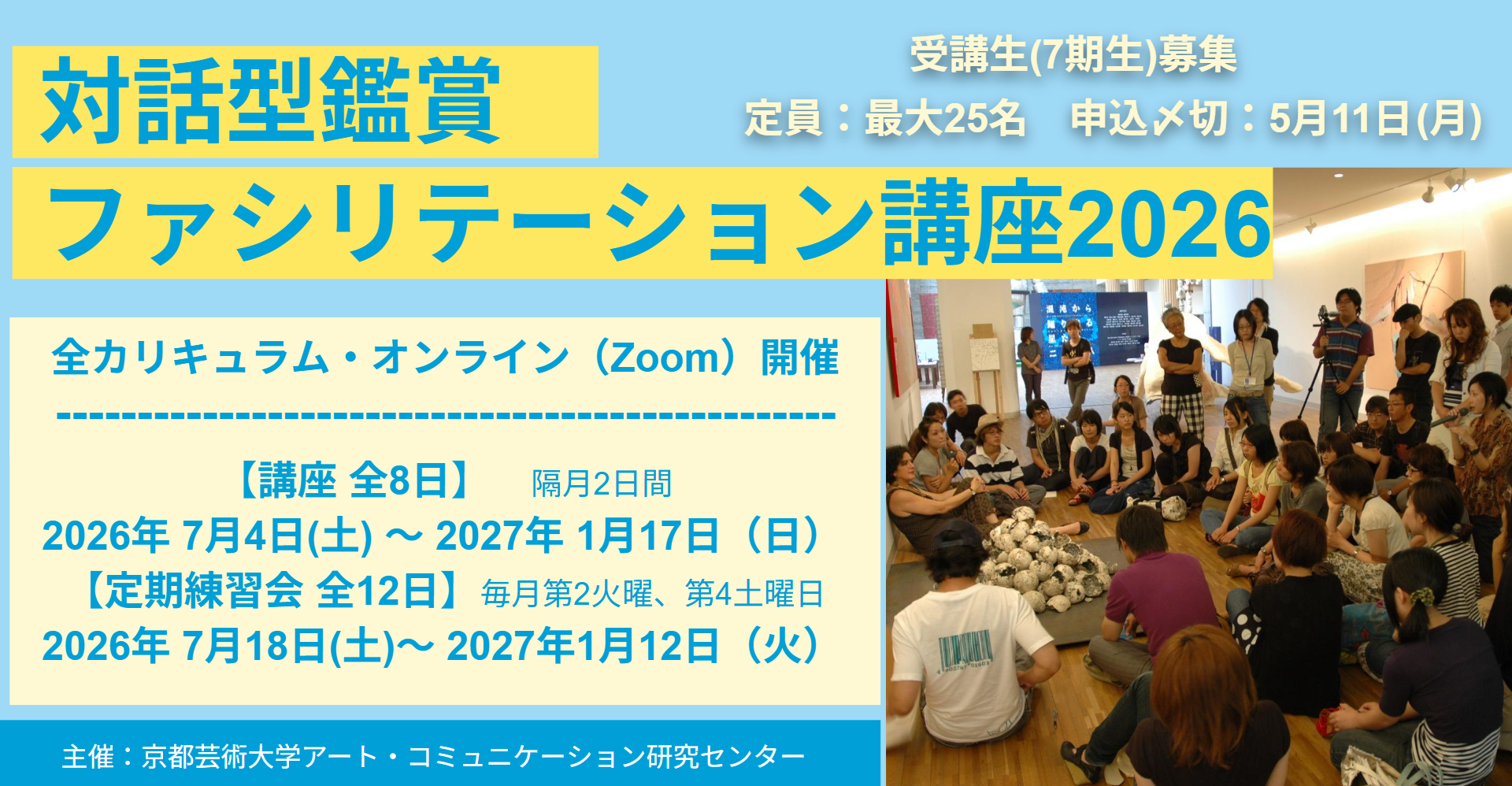 ACCでは、2026年7月から、今年で第7回を数える「対話型鑑賞ファシリテーション講座2026」を開講いたします。作品の鑑賞を通して、観察力や思考力、コミュニケーションスキルといった様々な能力の育成に寄与する対話型鑑賞*は、全国の美術館や学校現場を中心に取り組まれてきました。近年では、ビジネスシーンや医療現場における能力開発、さらにはコミュニケーションやコミュニティの創出など社会課題へのアプローチとしても、広く応用されるようになっています。
