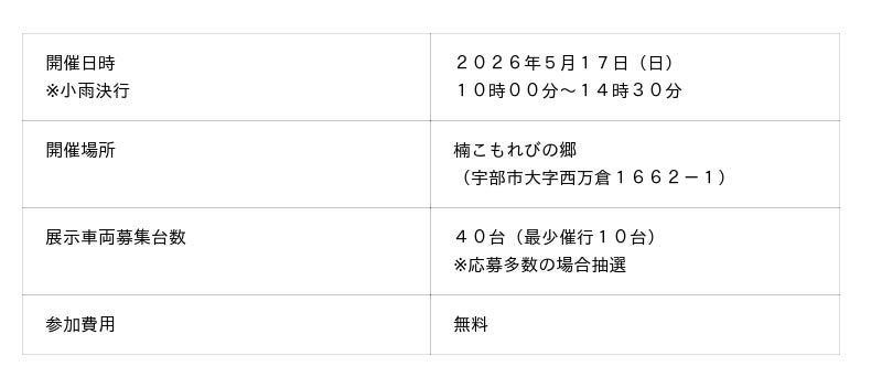 JAF(一般社団法人 日本自動車連盟)山口支部(支部長 佐藤宏彦)は、5月17日(日)に、楠こもれびの郷(山口県宇部市)にて、SUV・RVなどの四輪駆動車(以下、「四駆」)を集めた初の試みとなるイベント、「JAFデー 四駆ミーティング in 楠こもれびの郷」を開催いたします。