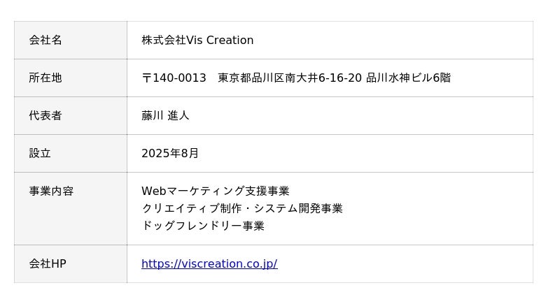 株式会社VisCreationは、犬と暮らすすべての人に向けたメディア・EC事業を展開。自社メディア「Dog Hug Life」では、犬とのおでかけ先・イベント・健康に関する情報など、愛犬家の日常に役立つコンテンツを幅広く発信。Instagram(@doghuglife)を通じてトレンド情報も発信しており、総フォロワー8万人を超える愛犬家コミュニティを形成しています。■ 会社概要