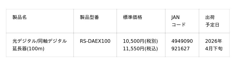 ラトックシステム株式会社(本社:大阪府大阪市西区、代表取締役:近藤 正和、以下ラトックシステム)は、最大100m伝送可能な光/同軸デジタル音声延長器を、4月下旬より出荷開始いたします。