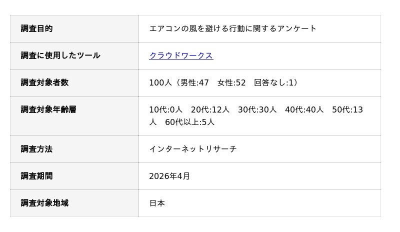 エアコンの風を避ける行動に関するアンケート調査の概要
