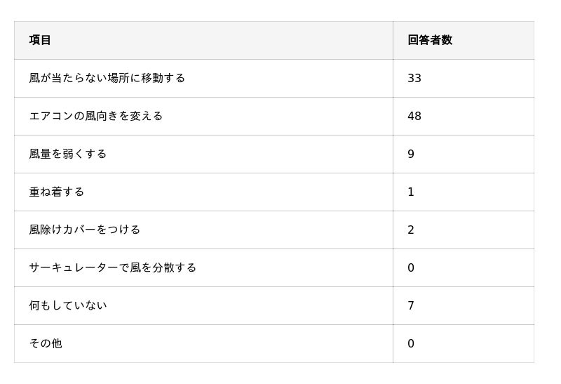 - エアコンの風を避ける行動で最も多かったのは「エアコンの風向きを変える」「風が当たらない場所に移動する」。