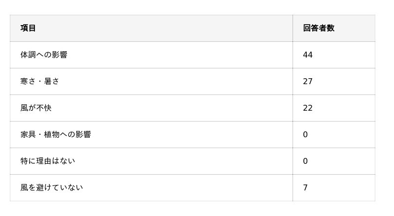 - エアコンの風を避ける理由には「体調への影響」「寒さ・暑さ」「風が不快」が挙げられた。