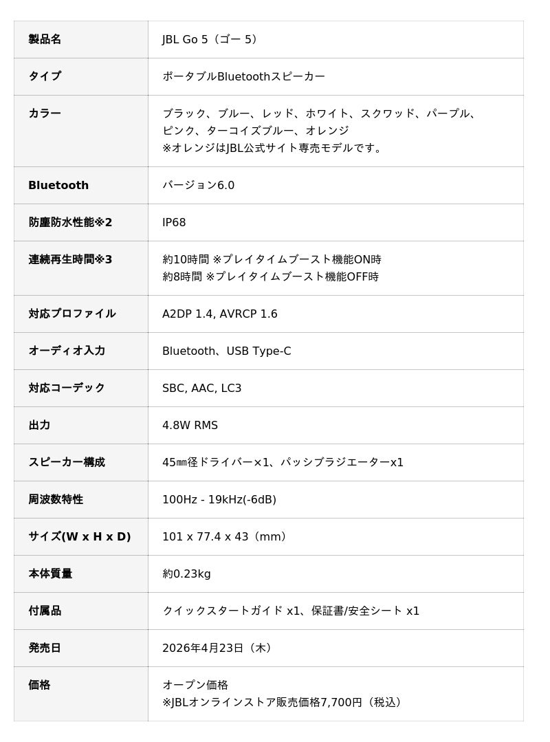 ハーマンインターナショナル株式会社(本社:東京都千代田区、代表取締役:桑原拓磨)は、アメリカ カリフォルニア発祥の世界最大級のオーディオブランドであり、日本においてワイヤレススピーカー8年連続販売台数No.1※1に輝く「JBL」より、人気のウルトラポータブルBluetoothスピーカーの最新モデル「JBL Go 5」を2026年4月23日(木)より発売いたします。