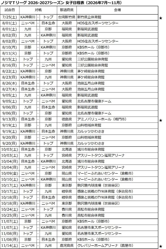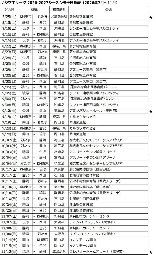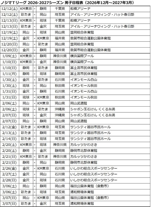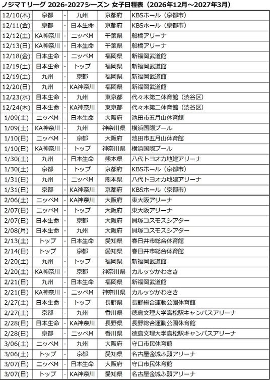 ノジマTリーグ 2026-2027シーズン 試合スケジュール