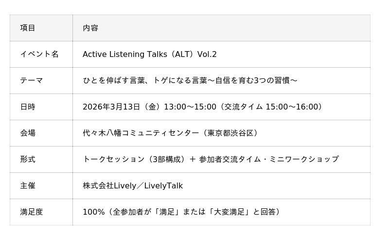 「聴く」を切り口に社会をアップデートする株式会社Lively(神奈川県藤沢市、代表取締役:岡えり)は、2026年3月13日(金)、東京・代々木八幡コミュニティセンターにて、教育評論家の親野智可等(おやの ちから)氏をゲストに迎えたトークイベント「Active Listening Talks(ALT)Vol.2」を開催いたしました。