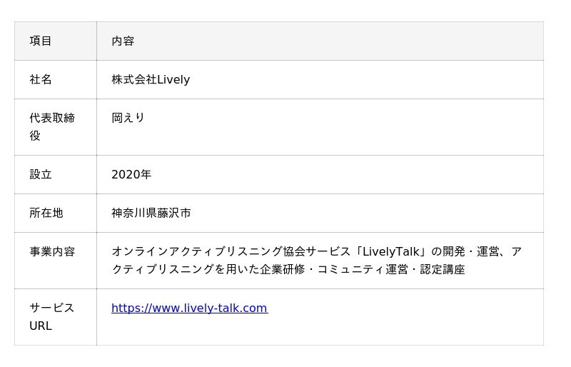 株式会社Livelyは、「聴くで世界を変える」をミッションに、アクティブリスニング(傾聴)の実践と普及に取り組む会社です。