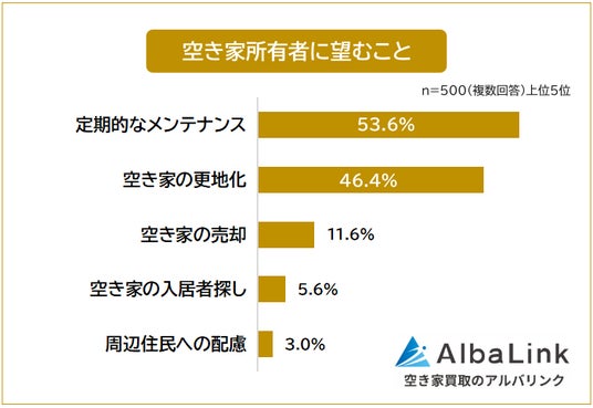 「空き家所有者に望むこと」の1位は「定期的なメンテナンス(53.6%)」、2位は「空き家の更地化(46.4%)」でした。