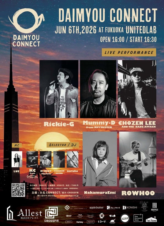 出演には、Rickie-G、Mummy-D(RHYMESTER)、CHOZEN LEE AND THE BANG ATTACK、Nakamura Emi、ROWHOOらが名を連ね、ジャンルの垣根を超えこの日限りのグルーブを生み出す。CROSS FM「DAIMYOU CONNECT」のナビゲーターとして福岡・大名拠点に音楽カルチャーを発信し続ける主催者中原雄一氏は「今回のイベントはただのライブではありません。その場にいる全員で作る”奇跡の夜”です。6月6日、最高の一日を作ります!」と語る。