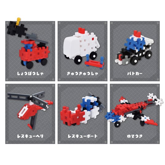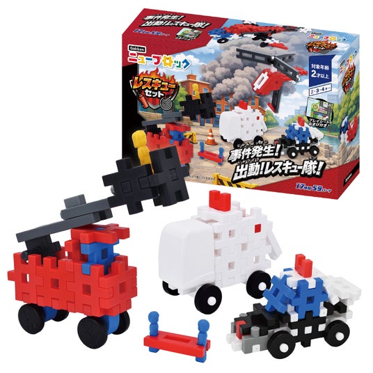 ニューブロックで消防車や救急車、レスキューヘリなど、緊急時に活躍するくるまを作ることのできるセットです。