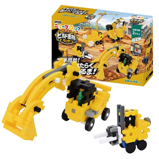 ショベルカーやブルドーザー、クレーン車など、工事現場で活躍する重機をニューブロックで作ることができるセットです。