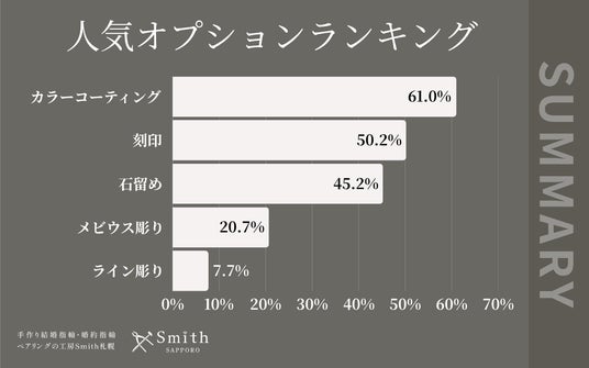 株式会社一宝(所在地:北海道札幌市)が運営する、北海道の手作り結婚指輪・婚約指輪・ペアリング工房「工房Smith京王プラザホテル札幌店」は、2026年3月にご依頼いただいたペアリングのオプションランキング結果をまとめました。