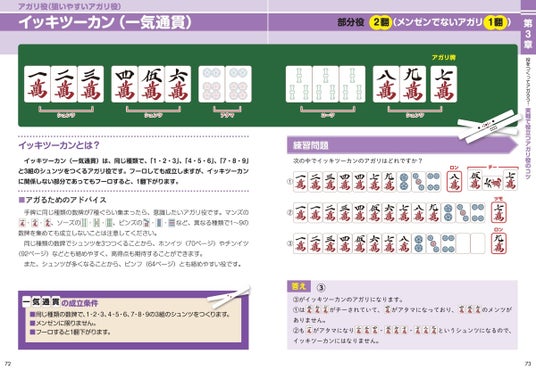 ▲アガリ役の解説では、ほぼ原寸大のマージャン牌のイラストで紹介。役にかかわる牌をくっきり見えるように、それ以外の牌の色味を薄くするなどして、自然に覚えられるよう工夫しています。