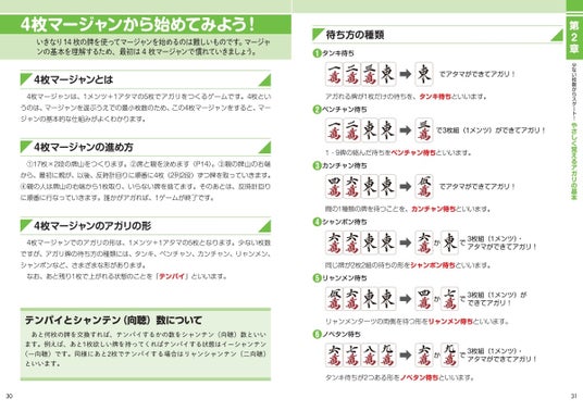 第1章 楽しく知るマージャンの基本牌の種類や呼び方、「親・子」の役割、そして対局の準備から終わるまでの流れなど、基本の「き」を丁寧に学びます。