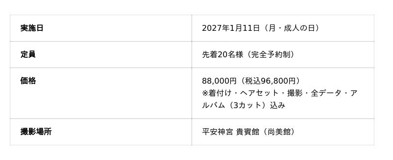 2027年成人の日「当日」を対象とし、着付け・ヘアセット・写真撮影まで、神宮の境内ですべてが完結いたします。