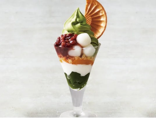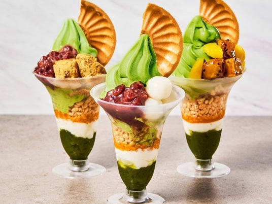伊右衛門の抹茶パフェ(あずき白玉)風味豊かな宇治抹茶を使用した伊右衛門カフェのソフトクリームパフェ。卵や牛乳などの動物性食材を一切使用しない100%植物性のヴィーガンソイクリームもお楽しみいただけます。