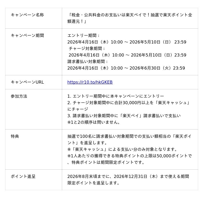 楽天ペイメント株式会社(以下「楽天ペイメント」)は、キャッシュレス決済サービス「楽天ペイ」アプリにおいて、「税金・公共料金のお支払いは楽天ペイで!抽選で楽天ポイント全額還元!」キャンペーンを2026年4月16日(木)から6月30日(火)まで実施することをお知らせします。