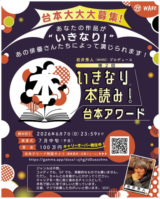 演出家・岩井秀人がプロデュースする初見の台本を舞台上で読み合わせる人気企画「いきなり本読み!」。今年も、「本読み!」の定番となる台本を募集する「第2回『いきなり本読み!』台本アワード」の開催が決定いたしました。