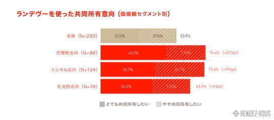 ランデヴーの「共同オーナー型で購入や維持費用を軽減」「メンテナンスや保険をランデヴーにおまかせ」などの説明を聞いた後に、ランデヴーを使った共同所有意向を聞くと、全体では半数以上の53.9%の人が、合理的志向やコミュニティ志向が強い人では、最大20%超も共同所有意向が高く、所有しない障壁になっていた課題をランデヴーが解決する可能性を感じていただけていると推察されます。