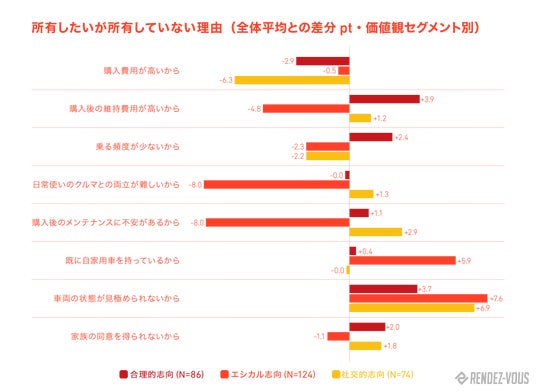 所有意向を持っているにも関わらず、現在所有していない理由として多かったのは、「購入費用」や「維持費用」の費用面が多く、続いて「乗る頻度が少ない」「日常使いのクルマとの両立」といった使用頻度に関するものが挙げられました。価値観セグメント別で分析すると、合理的志向やコミュニティ志向が強い人は、全体と比べると「購入費用」について挙げる人が少ない一方、「車両の状態を見極められない」ことを挙げる人が多く、お金だけでは解決できない課題を感じている人が相対的に多いことが分かりました。合理的志向やコミュニティ志向が強い人は、ランデヴーの説明を聞いた後の共同所有意向も高い。