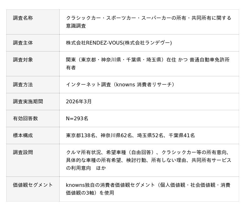 株式会社RENDEZ-VOUS(本社:神奈川県川崎市/代表:浅岡 亮太/以下、ランデヴー)は、関東(東京・神奈川・千葉・埼玉)在住で普通自動車免許を所有する男女303名を対象に、クラシックカー・スポーツカー・スーパーカーに関する意識調査を実施しました。