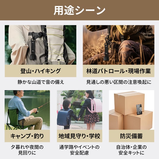 音で存在を知らせることで、熊など野生動物との不意の遭遇を減らす助けになります。熊は人の気配を察すると離れる習性があり、音を出すことは登山やキャンプ、農作業時の基本的な安全対策とされています。登山・林道・見回り・防災備蓄にお勧めのセットです。