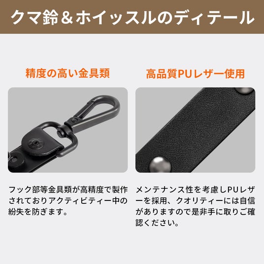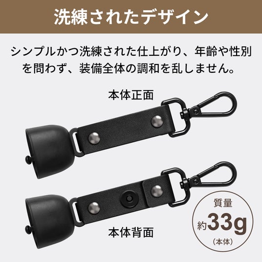 身に着けやすいカラビナ&ストラップ、33g(クマ鈴)と超軽量設計です。