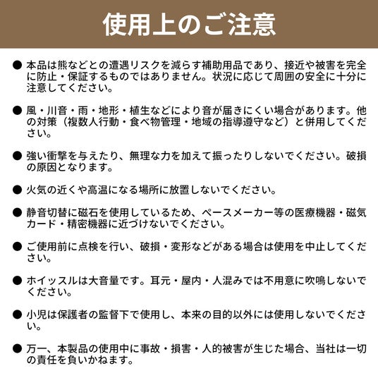 ※本品は熊などとの遭遇リスクを減らす補助用品であり、接近や被害を完全に防止・保証するものではありません。