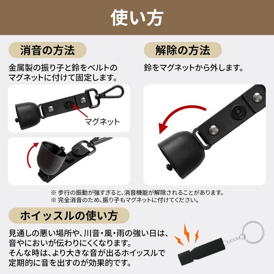歩行中は鈴、視界不良・緊急時はホイッスル。音で気づかせる二段構えの対策。