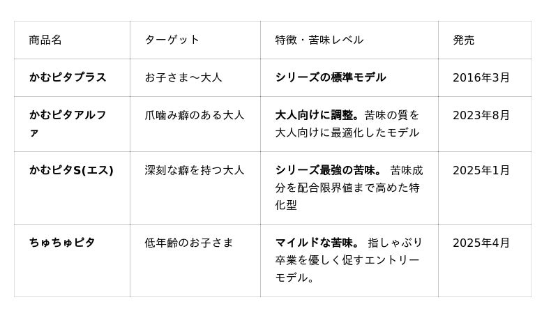 小さなお子さまが使うことを想定し、かむピタプラスよりも苦味がマイルドになっております。指しゃぶり卒業を優しく促すエントリーモデルとなります。