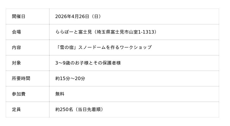 当社は昨年も「ごっこランドEXPO2025」でワークショップを開催し大変ご好評をいただきました。これを受けて2026年は、まもなく発売50周年を迎える当社の看板商品「雪の宿」をテーマとしたスノードーム制作を体験できるワークショップを年間6回開催し、第1回目を4月26日(日)にららぽーと富士見(埼玉県)で実施いたします。