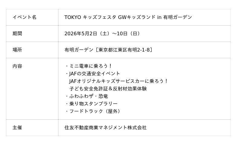 住友不動産商業マネジメント株式会社(本社:東京都新宿区 代表取締役社長:山本 直人)が、運営する複合商業施設「住友不動産 ショッピングシティ 有明ガーデン」(所在:東京都江東区)において実施する、「TOKYO キッズフェスタ GWキッズランド in 有明ガーデン」についてお知らせいたします。