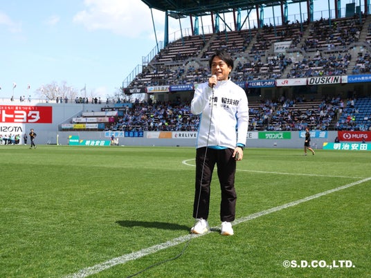 試合前には、マッチデースポンサー挨拶として木村情報技術 取締役の山口真悟が登場。新年度のスタートにあたり、新社会人をはじめとした新たな一歩を踏み出す方々へ向けたエールを送りました。試合は0対1で惜敗したものの、チームは最後まで諦めない熱い戦いを見せ、スタジアムに集まったファン・サポーターを沸かせました。