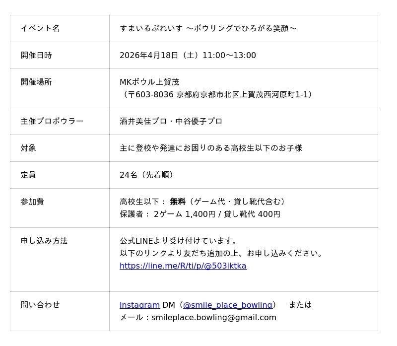 同イベントは、登校や発達に不安を抱えるお子様たちに、ボウリングを通じた「笑顔・達成感・仲間との出会い」を届けることを目的としており、弊社はその理念に深く賛同し、弊社が運営するMKボウル上賀茂での開催を全面支援いたします。